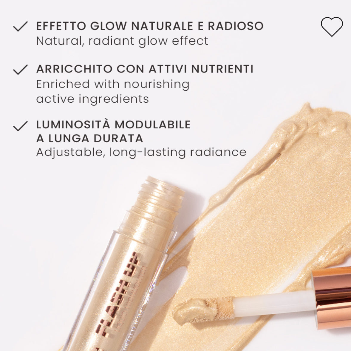 Flash Up è l'illuminante liquido perfetto per un effetto glow naturale e luminoso. Disponibile in tre tonalità versatili, offre una texture leggera e idratante che si fonde armoniosamente con la pelle. La formula, arricchita con Olio di Jojoba, vitamina E ed estratto di Lavanda, nutre e protegge grazie alle sue proprietà emollienti e antiossidanti. Ideale per valorizzare i punti luce del viso, regala una luminosità immediata e modulabile, mantenendo la pelle radiosa e idratata per tutto il giorno