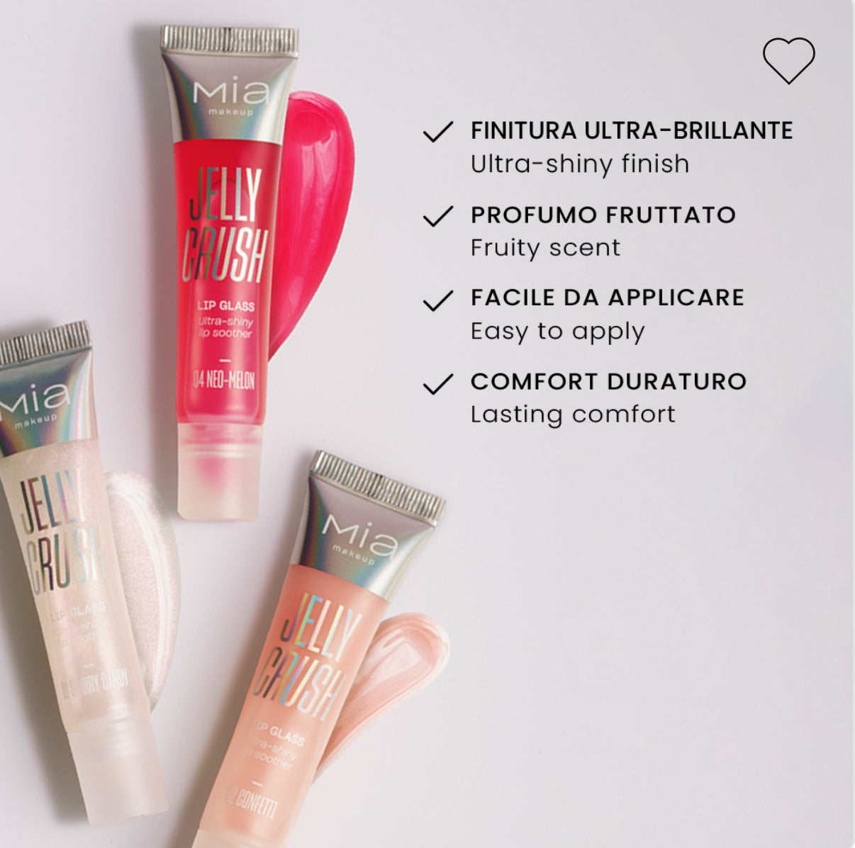 Jelly Crush è il perfetto ibrido per le labbra che unisce la luminosità di un gloss con il comfort idratante di un balsamo, senza l'effetto appiccicoso. La sua formula ricca di Vitamina E e olio di semi di girasole nutre le labbra in profondità, offrendo un tocco di colore delicato e una brillantezza straordinaria. Disponibile in cinque vivaci tonalità ispirate alla freschezza della frutta, con un packaging pratico in tubo dalla punta obliqua per un’applicazione facile e veloceovunque tu sia. Scegli tra cinque irresistibili profumazioni per un tocco di golosa freschezza.