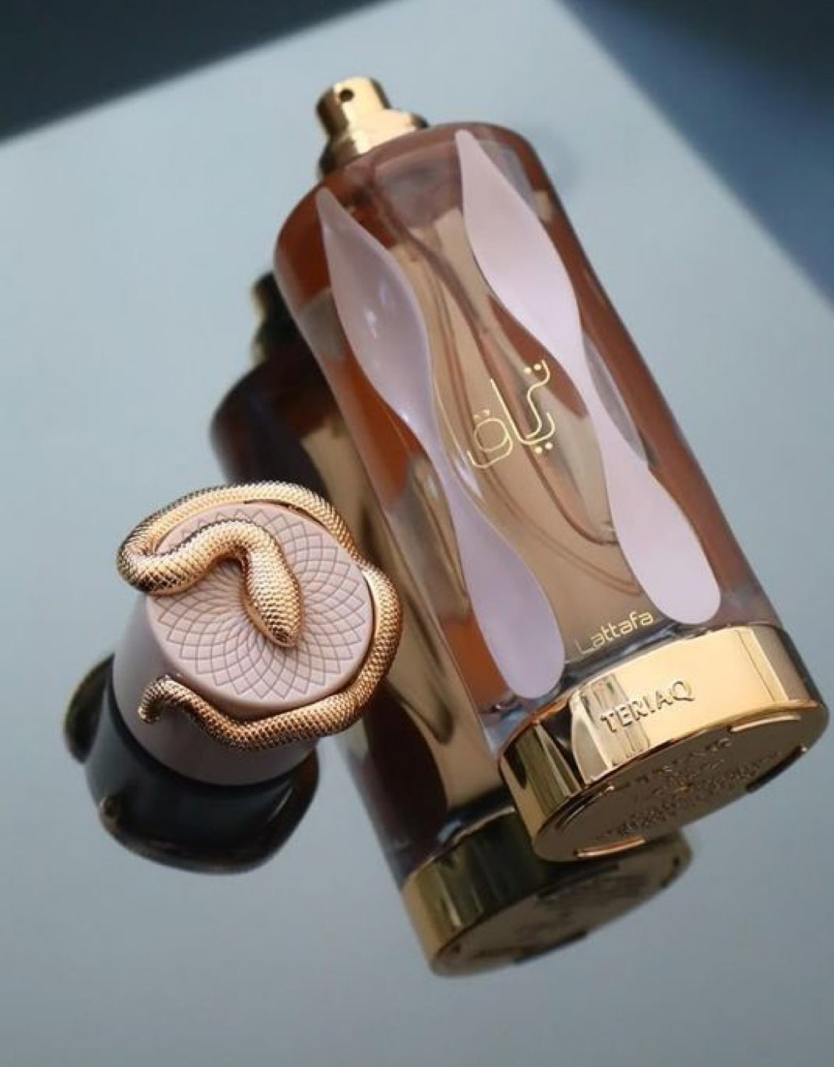 Teriaq di Lattafa Perfumes è una fragranza del gruppo unisex. È una nuova fragranza. Teriaq è stato lanciato sul mercato nel 2024. Il Naso di questa fragranza è Quentin Bisch. Le note di testa sono Caramello, Mandorla Amara, Albicocca e Pepe Rosa; le note di cuore sono Miele, Rabarbaro, Fiori Bianchi e Rosa; le note di base sono Cuoio, Vaniglia, Muschio, Labdano e Vetiver.