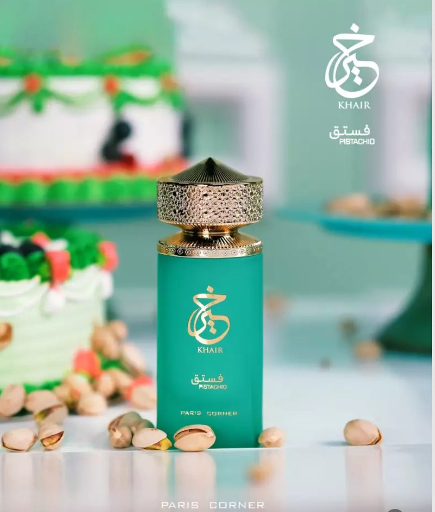 Khair Pistachio di PARIS CORNER è una fragranza del gruppo Floral Fruity Gourmand unisex. È una nuova fragranza. Khair Pistachio è stato lanciato sul mercato nel 2023. Le note di testa sono Pistacchio, Gelato, Bergamotto, Nocciola, Cardamomo e Rum; le note di cuore sono Pera, Gelsomino, Peonia, Lampone, Pesca Bianca e Geranio; le note di base sono Panna Montata, Marshmallow, Zucchero Filato, Fava Tonka e Legno di Cedro.