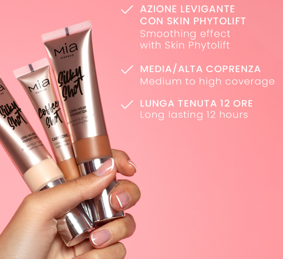 Fondotinta fluido dal finish matte naturale. Grazie all’attivo perfezionatore Skin Phytolift, i segni di espressione appaiono otticamente attenuati per un effetto incarnato levigato. La texture modulabile del fondotinta permette di ottenere una coprenza da media ad alta, andando ad attenuare le discromie, per un viso senza imperfezioni visibili. La formula a lunga tenutaassicura un finish opaco ed un effetto blurring per tutto il giorno. Il fondotinta Silky Shot è disponibile in una gamma di 24 nuance classificate in 7 sottotoni per rispondere alle esigenze di tutte le tonalità di pelle.