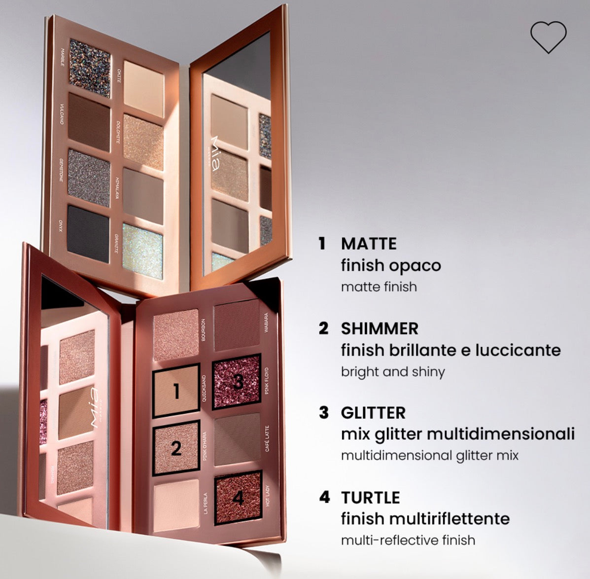 Composta da 8 ombretti multi finish, unisce l’eleganza dei toni grigio e taupe a colori metallici e luminosi, ideali sia per look naturali che più intensi.
